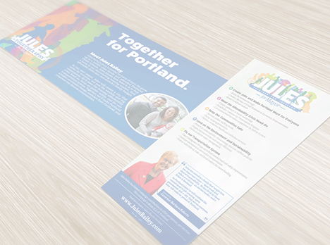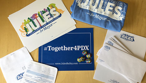 Materials needed for a Mayoral candidate in Portland; Jules Bailey needed collateral that showed his love for the city and it's citizens. Each item rallies behind the idea of "Together for Portland" in both visuals and message.