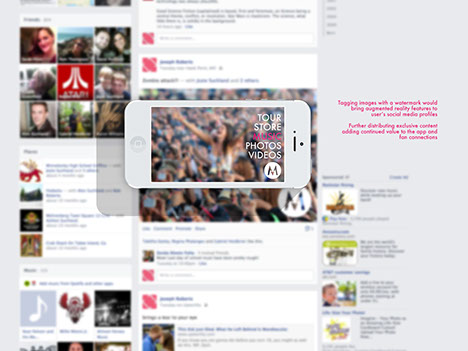 Proposed application to utilize augmented reality features to give the user a new experience with content. From taking a photo and tagging themselves and friends to being able to access special features from other users social media content.